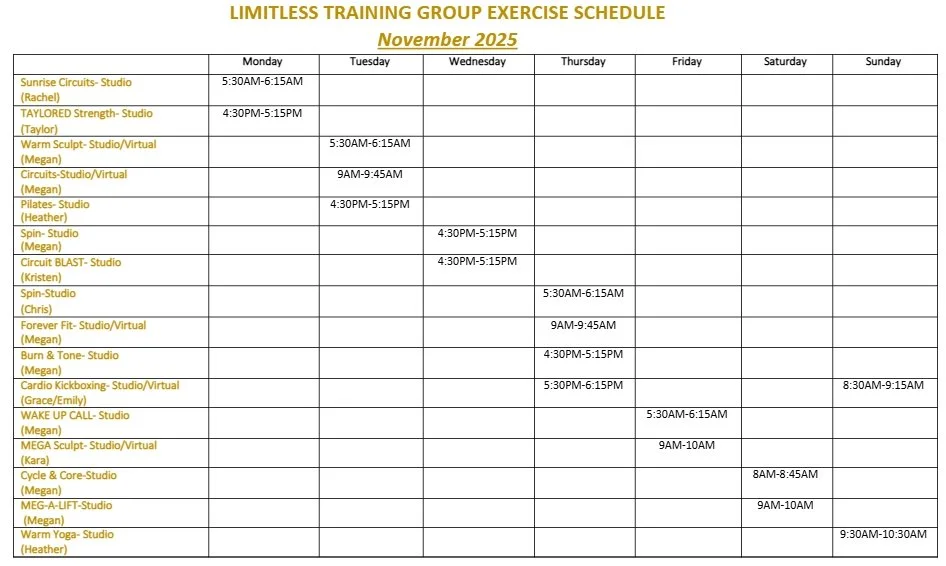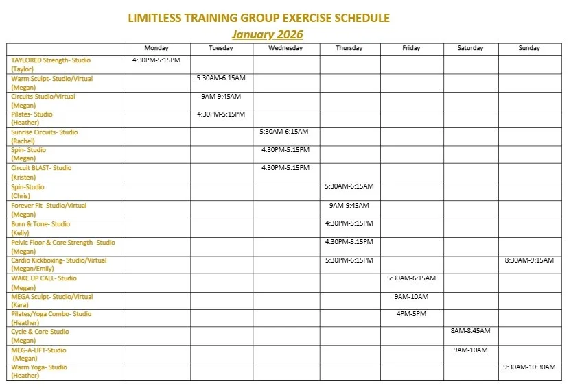 Need a change of scenery?! Don’t feel comfortable in a gym setting or just want to try something new? Then come to Limitless Training Studio! We offer classes for every fitness level! All classes are sign up only, so please show up 10-15 minutes early to set up for class and inform the instructor if any modifications need to be included. Please bring water and a mat if possible. Mats will be supplied if needed. Each class is carefully designed to push you out of your comfort zone and help you get the most out of your workout. Participants are recommended to go at their own pace if need be and more importantly we are here to have fun!